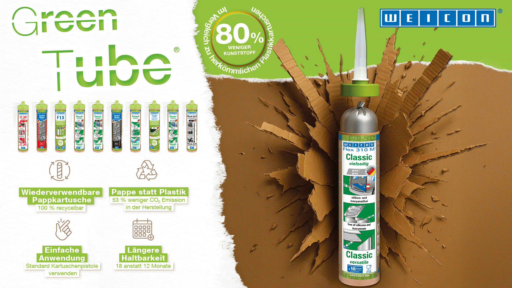 The Green Tube cardboard cartridge replaces conventional plastic adhesive cartridges, which are usually incinerated. The main focus during development: avoiding plastic waste by significantly lowering the plastic content by 80%. The cartridge body is made of 100% cardboard and can be recycled after use. The cap and clip nozzle are made from recycled plastic.