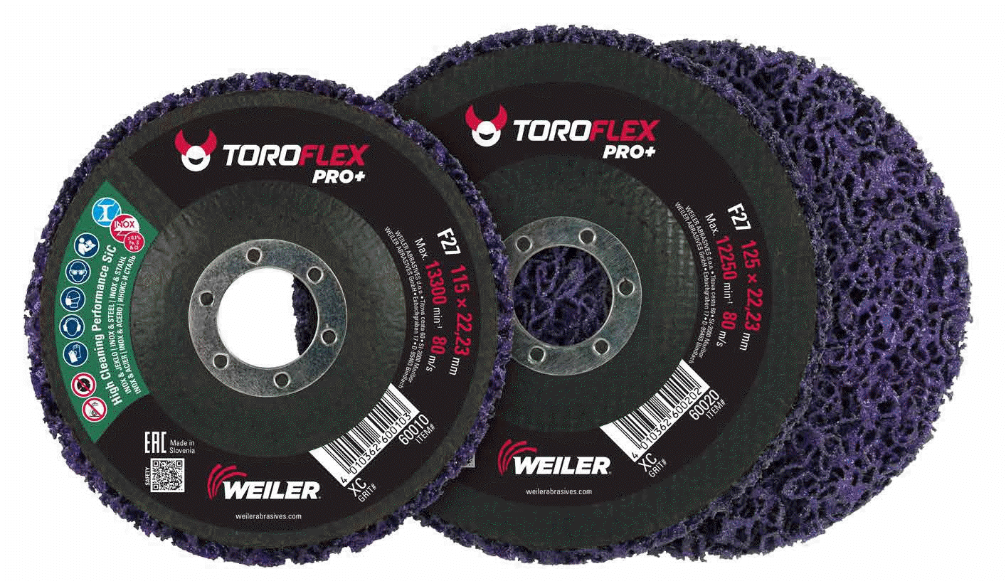Weiler Abrasives Toroflex PRO+ non‑woven strip discs offer a fast‑cleaning, long‑life solution for steel and stainless steel. Silicon carbide grains provide a high initial cut and penetration, making them ideal for cleaning hard surfaces. The ultra‑flexible non‑woven nylon fiber and resin formula creates a wider footprint that increases productivity without compromising disc life. Toroflex PRO+ SiC provides best‑in‑class material removal, ensuring a durable and long‑lasting solution for your surface cleaning needs.