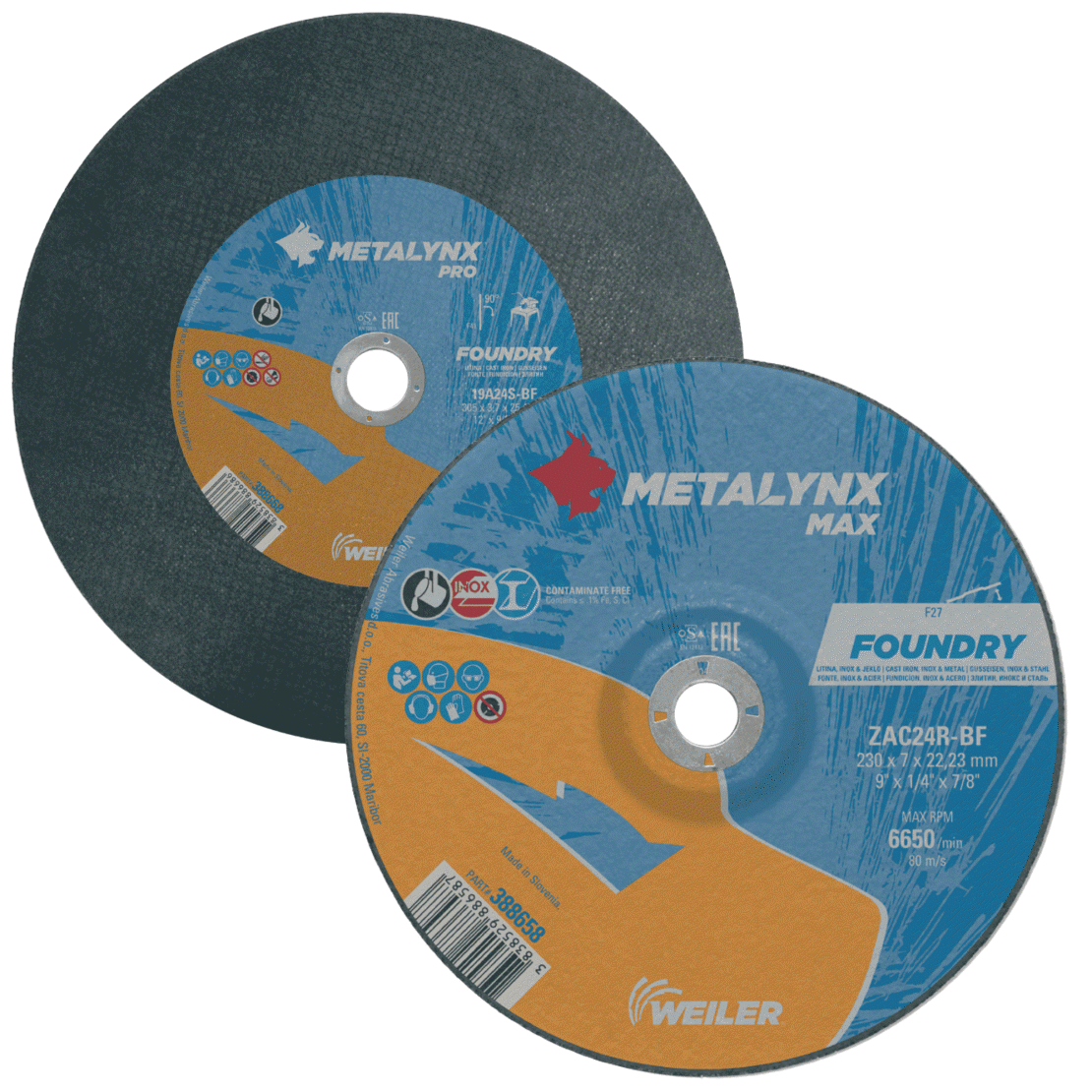 Metalynx MAX cutting and grinding Combination Wheels for foundries help professionals get the most demanding jobs done right, and done fast. These wheels offer flexibility and efficiency when switching between cutting and grinding applications. A specially engineered third layer of fiberglass reinforcement provides the strength for grinding, while maintaining a fast cut.