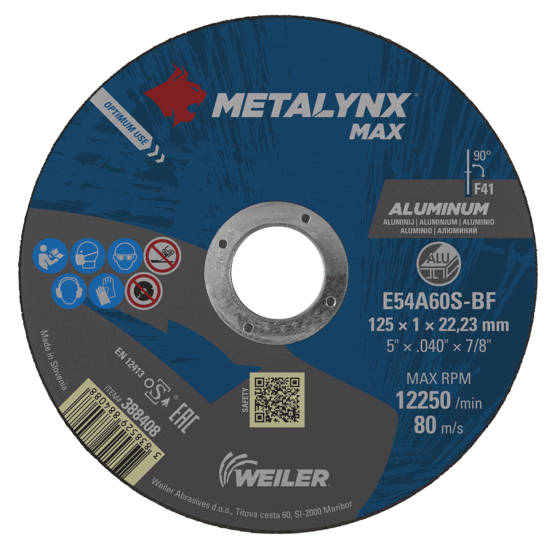 Metalynx MAX Aluminum wheels are designed for high-performance cutting on aluminum. These wheels leverage a unique blend of abrasive grains and contaminant-free additives that prevent loading, resulting in higher cut rates and long wheel life.