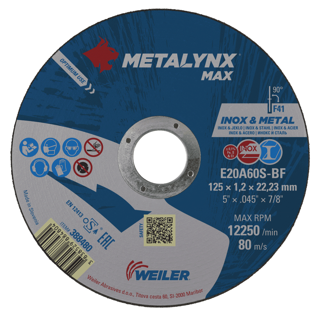 Metalynx MAX Inox & Metal cut-off wheels provide a fast cut rate and long wheel life when working with stainless steel and hard grade steels. These wheels now last up to 40% longer without sacrificing cut rate, resulting in fewer change-overs and more cuts over the life of the wheel. They are the perfect fit for professionals that need a high-performance solution for the most demanding jobs.