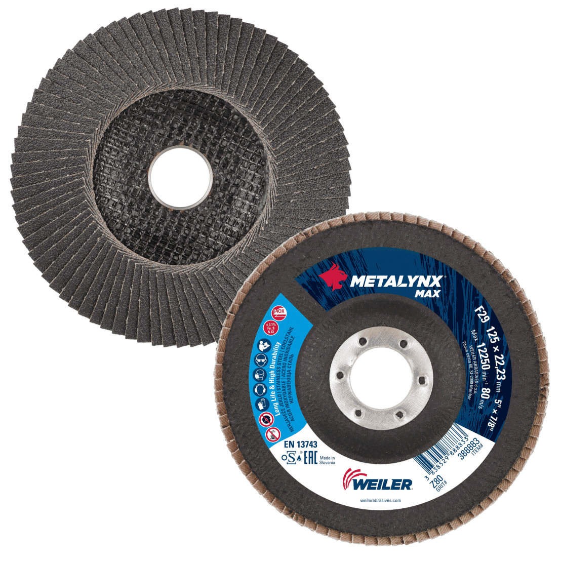Metalynx MAX Zirc flap discs are designed for demanding metalworking applications. These discs leverage 100% zirconia alumina grains that hold up under high temperatures and extreme pressure. The result is maximum aggression for sustained stock removal on alloys, tough non-ferrous metals, stainless steel, and high-alloy, heat-resistant, heat-hardened steel.