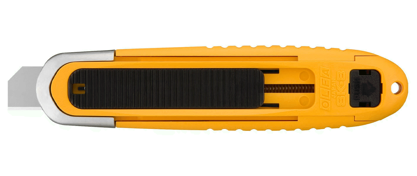 The biggest difference of the SK-8 from usual safety knives is that the blade automatically retracts after cutting or when it loses contact with the material being cut even if the blade slider is engaged. Accommodates both right- and left-handed users. Durable Aluminium Die-Casting Head. ComfortGrip. No tools requird for blade replacement.