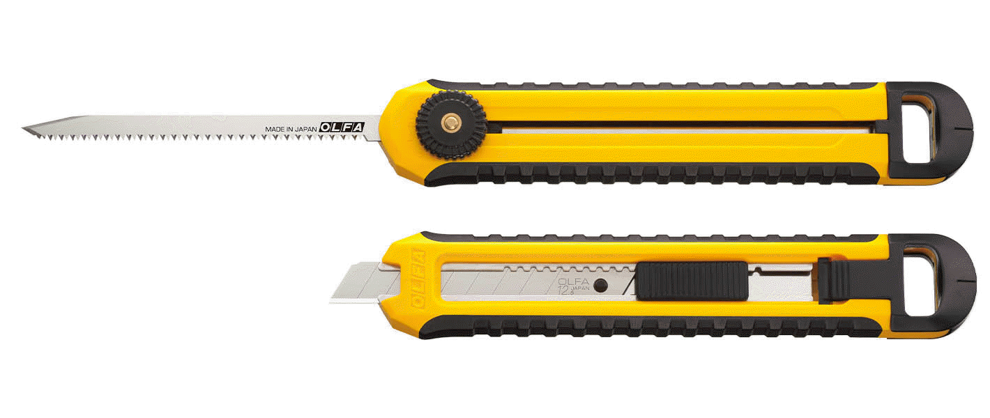 A combination of Keyhole Saw Blade and 12.5mm Snap-Off Blade is all needed. The saw blade is bi-directional, works as a pull-saw as well as a push-saw. Its sharp-pointed tip drills a hole in a board to start cutting. The hard-to-bend 12.5mm-wide x 0.45mm thick snap-off blade cuts tough materials stronger than people expect from its appearance.