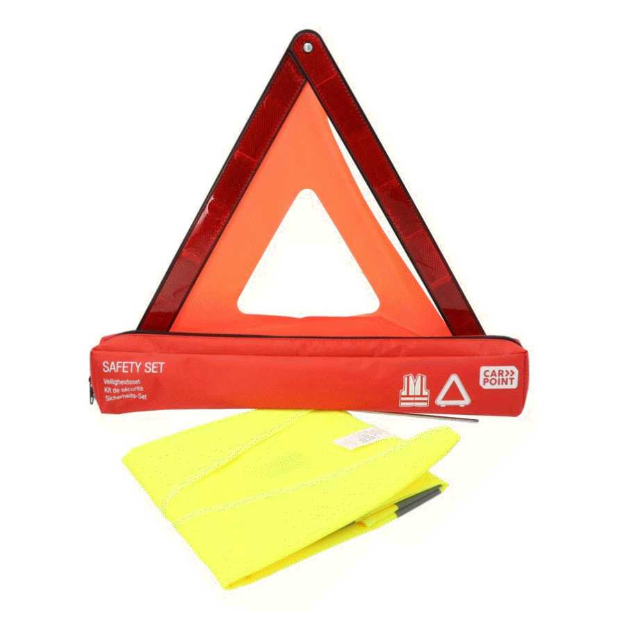 Carpoint safety kit with a warning triangle and safety vest. In many countries, it is mandatory to have a warning triangle and one or more safety vests in the car. The reflective Carpoint warning triangle is easy to unfold and stands stable on its four folding feet. Equipped with an extra striking flexible reflective PVC triangle. The striking yellow safety vest is made of 100% polyester and the reflective stripes are visible in the dark from a long distance. The warning triangle with E-Keur safety vest with EN ISO 20471 standard comes in a handy zipped bag and measures 45x5x8cm.
