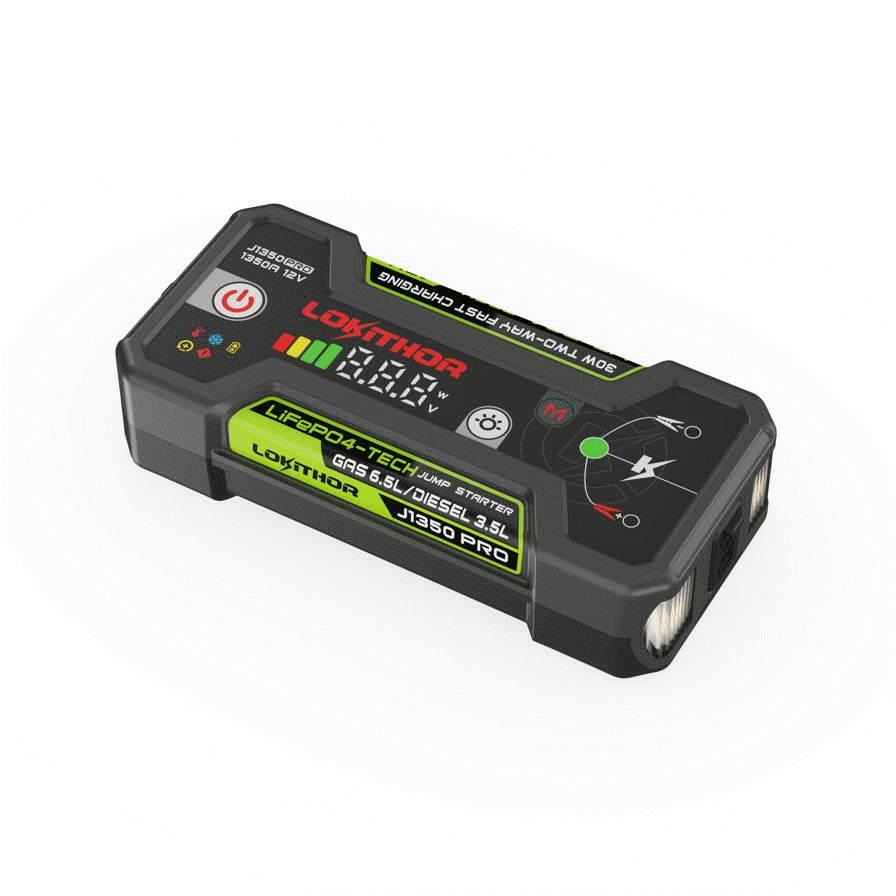 The Lokithor J1350 PRO LiFePO4 jump starter for car is manufactured with 100% safe energy. The 12-volt jump starter delivers a high starting current of 1350 amps and is therefore suitable for petrol engines up to 6.5 litres and diesel engines up to 3.5 litres. With the quick charge function PD 30 W in two directions, you can fully charge your car in one to one and a half hours or charge in just 3 minutes. The internal power bank offers an output power of 30 watts, allowing you to effortlessly power your USB-C devices such as phones, tablets, and laptops. Connect Max Technology optimises jump-start efficiency by detecting the impedance of the terminal connection, ensuring reliable performance every time. With LED torch equipped with three dynamic modes: torch, strobe light and SOS light. The Lokithor J1350 has a service life at least five times longer than that of a lead battery and twice as long as that of a lithium starter. A premium device that has 10 types of built-in protections to ensure exceptional safety and protection. The incredibly low self-discharge current of 0.21 mAh of the J1350 lifepo4 jump starter guarantees a standby time of more than 24 months and ensures that your device is always ready for use.