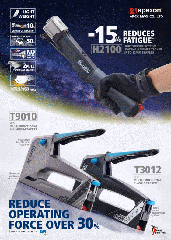 H2101 hammer tacker uses composite material, which lessens its weight when comparing to a traditional metal body. Its life test cycles can rival other traditional types. Furthermore, its weight distribution is optimized to assure users of pleasant stapling experience and reduce arm fatigue by up to 15%.