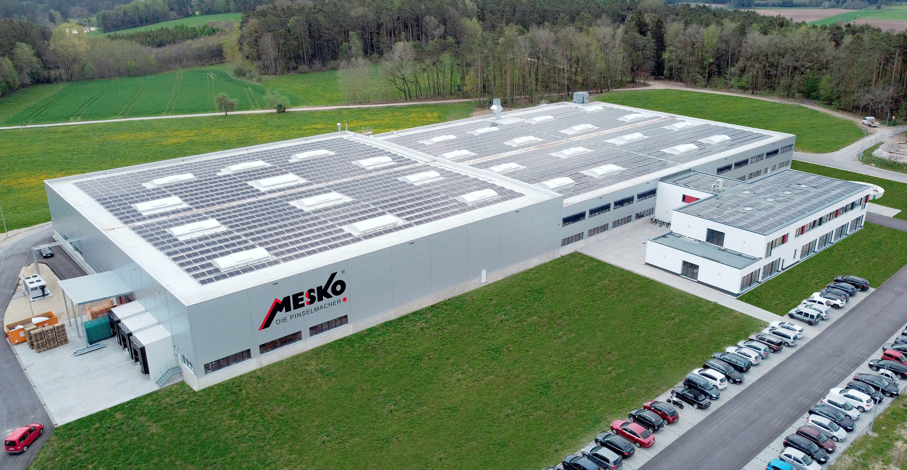 Mesko-Pinsel GmbH produces high-quality brushes as well as a wide variety of plastic products in its new building, which was constructed in 2021 and covers an area of over 11,000 m². This sends a clear signal about the company's future, continued existence and sustainability.Our roof area of approx. 8,000 m² is used, for example, to generate solar energy (1.2 MWp photovoltaic system) which we use for our production. The system can save up to 540 tonnes of CO2 per year, which corresponds to the electricity supply of approx. 280 four-person households per year.